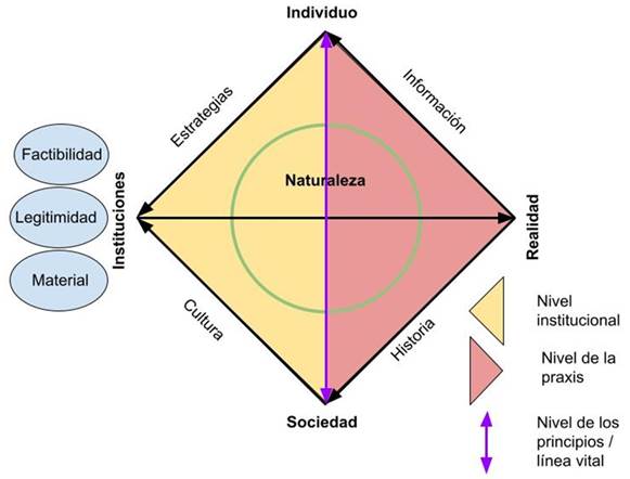 D’Ambrosio (2013) plantea esquemáticamente la relación entre el individuo, la sociedad y la realidad-naturaleza para explicar la manera en que el saber es producido, organizado, legitimado y socializado como herramienta para la sobrevivencia y la trascendencia (véase Gráfica 5), como un proceso en el que los sujetos transforman y son transformados por la realidad a partir del uso del saber matemático -y otros saberes-, pero operando siempre en relación con la preservación de la vida, representado en el triángulo primordial de la vida modificado y articulado como la línea vertical que atraviesa la naturaleza y que conecta al individuo con la sociedad, el cual se denomina línea vital de la política.
