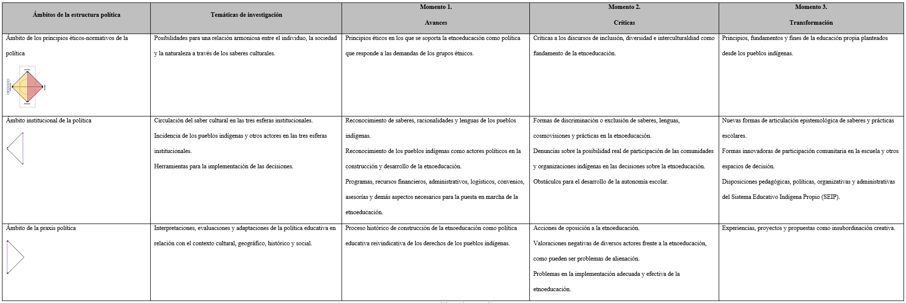 Hasta aquí, las categorías presentadas conforman un marco teórico como horizonte de comprensión que pretende convertirse en marco analítico en tanto produzca herramientas que permitan analizar las políticas educativas como las que se proponen a continuación, orientadas a situar las políticas de educación indígena y educación matemática en relación con la acción estratégica de los actores políticos, la institucionalidad y los principios normativos en un horizonte de transformación emancipatoria.