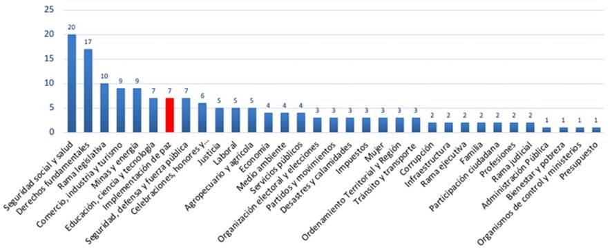 La transición ideológico-discursiva no sólo se hace evidente en los testimonios de los congresistas de Comunes, sino también en el tipo de proyectos de ley que han presentado en el Congreso. Según la base de datos de Congreso Visible (s. f.), el partido ha logrado adelantar más de cien proyectos de ley. Como se aprecia en la Gráfica 1, los temas sobre los cuales más ha legislado la FARC-Comunes entre 2018 y 2021 no tienen fines de transformación estructural, sino que principalmente acompañaron iniciativas de alivio frente al impacto de la pandemia y debates de control político propuestos por otros partidos.