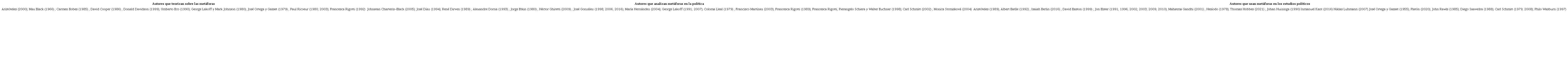 La idea es que académicos y políticos o, si se quiere, políticos y científicos, como lo propone Weber (2012), se interesen en conocer y hacer uso de las metáforas. Para lograrlo se puede seguir tres caminos: el primero es recurrir a las personas expertas para que nos digan cómo se analizan las metáforas, cuáles son sus teorías y escuchar sus sugerencias. Autores como los que se identifican y señalan en la primera columna del cuadro 1 evidencian que el camino de lectura es largo. Maestros de la metáfora como Mark Johnson, Hans Blumenberg, Paul Ricoeur y Georg Lakoff tendrán mucho que decir. Ellos nos hablan de las metáforas vivas y de las muertas, las cuales usan de manera marginal para ilustrar, o de la estructurales, las cuales aparecen de forma preponderante (González, 2006, p. 14).