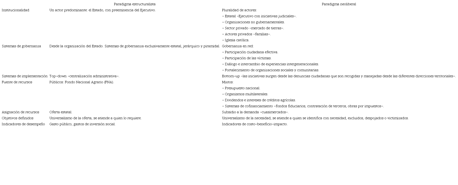 De una parte, el enfoque estructuralista de la reforma agraria estuvo caracterizado por políticas redistributivas, fuerte aparato institucional, centralismo y planificación con énfasis en procesos industrializadores; por otra parte, el enfoque neoliberal de la reforma agraria puso la distribución de la propiedad rural en manos del mercado, disminuyendo la intervención del Estado y confiando en la oferta y la demanda; finalmente, la RRI toma elementos de ambos enfoques, lo que puede generar problemas en la implementación futura de la política agraria.