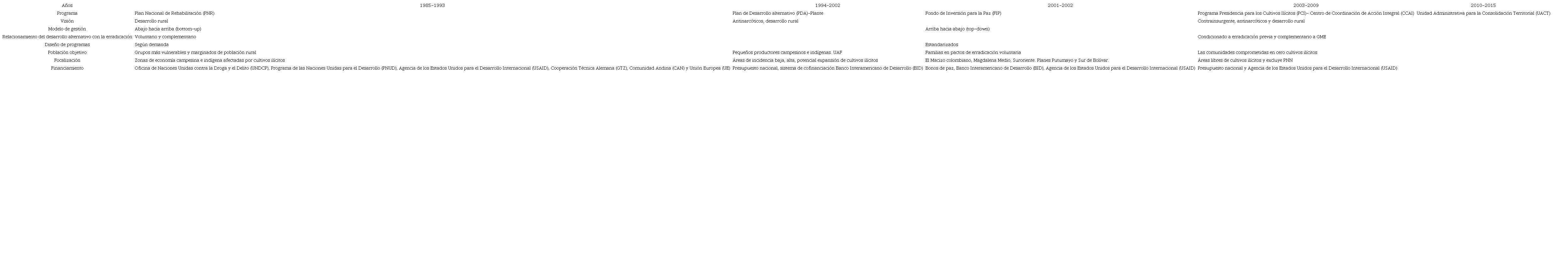 El diseño de la política social en Colombia para enfrentar el fenómeno de los cultivos de uso ilícito se define a partir de una concepción neoliberal del problema y sus soluciones, particularmente, desde las apuestas del desarrollo alternativo. Como lo plantea Ricardo Rocha (2016), los esfuerzos de las políticas antidrogas han girado en torno al desarrollo rural, el medio ambiente, la criminalidad y los procesos de paz. El énfasis que se da a cada aspecto ha dependido de situaciones concretas y complejas de cada momento histórico (véase Cuadro 1).