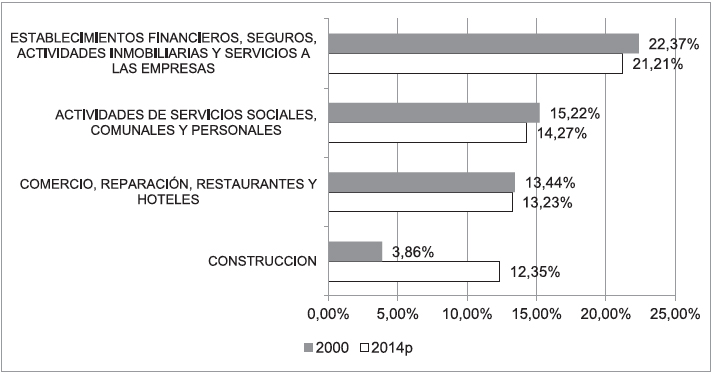 Conviene señalar que es normal que el mercado laboral durante el primer trimestre de cada año refleje unos ajustes derivados del ciclo económico, es decir, al pasar la temporada de diciembre se registra un aumento en el desempleo y una disminución en el empleo. No obstante, hay que tener en cuenta que en el AMVA siete (7) de cada diez (10) ocupados están concentrados en tres sectores económicos (comercio, servicios e industria manufacturera) y que dichos sectores han demostrado cierta sensibilidad frente al ciclo económico. Además, conviene recordar que en el AMVA se ha deteriorado el nivel de empleo industrial debido al proceso de desindustrialización y a la movilidad empresarial, aunque el sector relacionado con actividades inmobiliarias, empresariales y de alquiler ha aumentado el nivel de empleo y la participación en el total en dichos períodos de desaceleración económica. Asimismo, mantiene una tendencia creciente desde 2005, creando aproximadamente 100.000 empleos desde entonces. También es importante mencionar que la construcción aporta el 7 % del empleo total y registra una tendencia creciente, tal vez producto del auge que todavía parece presentarse en el Área Metropolitana. Según Coronel (2015, p. 8) si continúa esta tendencia pese a la desaceleración económica que se tiene prevista en 2016, podría ayudar a amortiguar la caída del empleo, máxime cuando la ciudad avanza en megaproyectos como Parques del Río, el túnel de Oriente, entre otros.