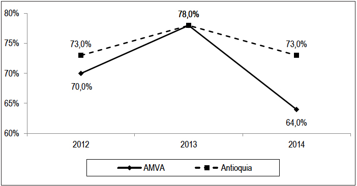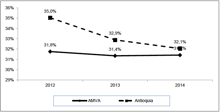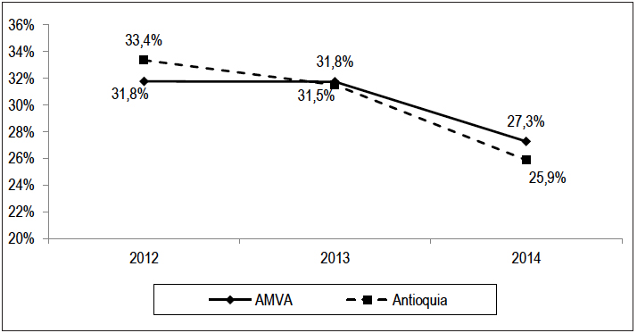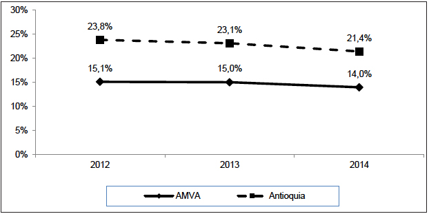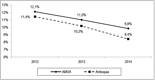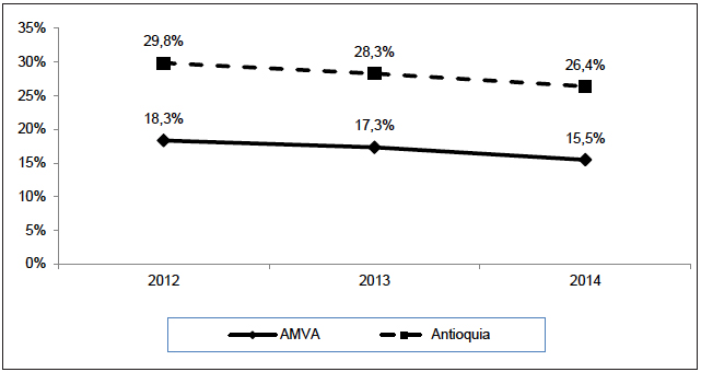 Los resultados muestran que en el AMVA dicho indicador pasa de 15,1 % a 14 %, lo cual significa una disminución de 1,1 puntos, mientras que en el contexto departamental la mejora fue 2,4 puntos. La brecha entre el AMVA con el departamento reflejó un leve cierre.