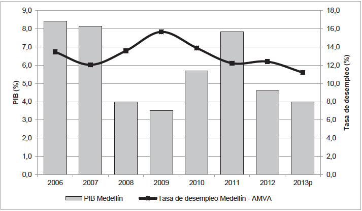 Teóricamente se sostiene que los ingresos guardan relación con el crecimiento económico y que dicho crecimiento trae consigo la creación de nuevos puestos de trabajo; por lo tanto, antes de presentar los resultados es conveniente conocer la relación entre el ciclo económico y el comportamiento del desempleo en el AMVA como una manera de aproximarse al estudio de la dinámica del mercado laboral local. La evidencia empírica demuestra que entre los años 2007 y 2009 cuando la tasa de crecimiento del PIB de Medellín pasó de 8 % a 3,5 %, se produjo un aumento del desempleo de 12 % a 15,7 %, lo que se pudo haber traducido en cerca 85.000 nuevos desempleados. Esta sencilla evidencia empírica muestra una posible relación entre dichas variables, ratifica y amplía los hallazgos de López, Lotero y Arango (1992) y de López (1997), y sirve para llamar la atención en estos momentos cuando la ciudad y su área metropolitana enfrentan dificultades económicas.
