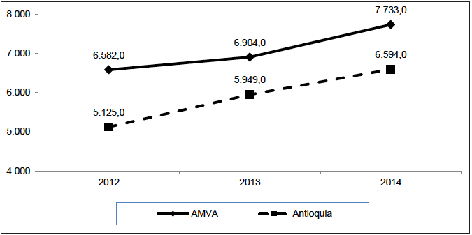 Si se analiza este indicador por sexo, se comprueba que en el AMVA las mujeres tienen un ingreso medio por hora menor que los hombres; mientras que en el contexto departamental el comportamiento entre hombres y mujeres, si bien es creciente para ambos, las mujeres en 2013 estuvieron por encima de los hombres.