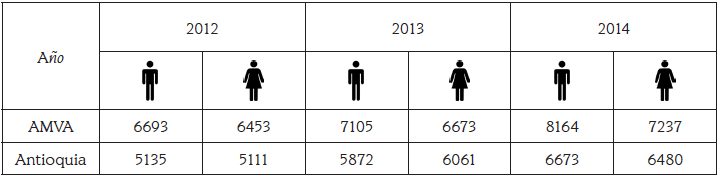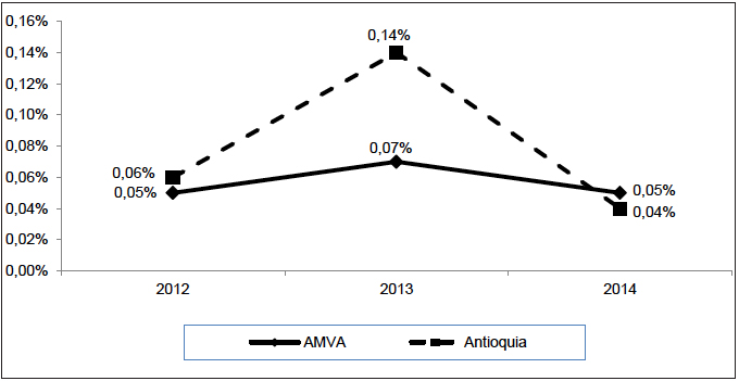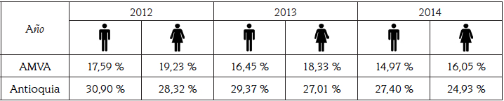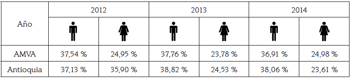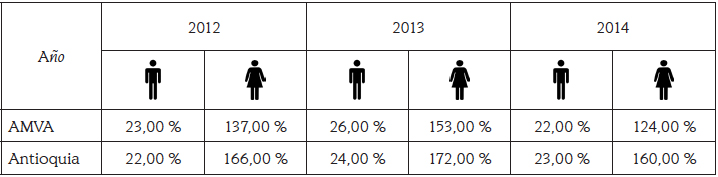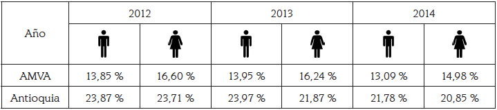 Al revisar los resultados del indicador por sexo se evidencia que en el AMVA los hombres registran una tasa mayor que las mujeres; aunque mientras los hombres registran un promedio de 37 % para los tres años, las mujeres registran una tasa de 25 %.