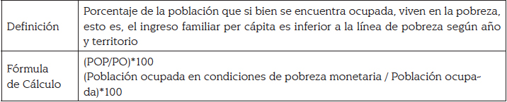 Este indicador ofrece información sobre la relación empleo–pobreza, es decir, combina datos del mercado de trabajo (ocupación) con datos de ingresos de los hogares, midiéndose así el porcentaje de trabajadores que, aunque tienen un empleo, viven en hogares identificados como pobres. Hay que aclarar que el concepto de pobreza aplicado en este indicador corresponde a que el ingreso familiar per cápita es inferior a la línea de pobreza; por lo tanto, es un concepto que se aplica a los hogares y no a los individuos. Según estas consideraciones, una reducción de este indicador significa avances en la dimensión de ingresos suficientes y productividad propuesto por la OIT; por ende, son avances hacia el trabajo decente.