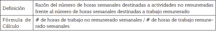 El propósito del indicador es mostrar las cargas de tiempo de trabajo entre aquellas actividades remuneradas y las que no lo son. La premisa sobre la cual se parte es que los trabajadores dedican parte de su tiempo a actividades no remuneradas en el hogar y que dicha carga impide aceptar otras demandas de trabajo remuneradas fuera del hogar, lo cual tiene incidencia en la productividad, en los ascensos laborales, en la salud, entre otros aspectos. Pineda (2013, p. 46) sugiere que a medida que exista un mayor proceso de modernización de las ciudades, entendido como una mayor comercialización de aquellas actividades que antes no se remuneraban por ser realizadas en los hogares pero que ahora se realizan en establecimientos de comercio, se puede explicar un descenso en el indicador. Dichas actividades pueden estar relacionadas con la venta de alimentos, lavado de ropa, lavado de autos, belleza y cosméticos, entre otros.