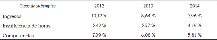 La tendencia que refleja este indicador muestra que cada vez hay menos personas que se encuentran insatisfechas en su trabajo y que cada vez hacen menos gestiones para cambiar de empleo. Al revisar los resultados de los subempleados por insuficiencia de horas, es decir, aquellos que consideran que trabajan menos y podrían aumentar su tiempo en el trabajo, se aprecia que son la menor tasa dentro de los demás tipos de subempleo y pasó de 5,43 % en 2012 a 4,19 % en 2014.