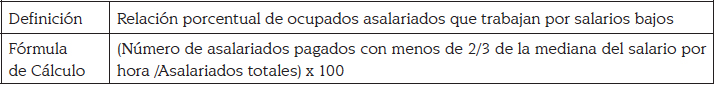 Este indicador complementa la lectura sobre ingresos insuficientes y productividad, ya que, sumado al indicador anterior, empieza a ofrecer pistas sobre qué tan pobres son los trabajadores, según la distribución de los salarios por hora. Se considera como un asalariado pobre aquel ocupado asalariado que devenga menos de 2/3 de la mediana del salario por hora en cada año. En tal sentido entre más alto sea el indicador significa que existe un mayor número de asalariados que reciben una baja remuneración.