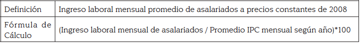 Este indicador se incluye en la medición pero debe ser interpretado con la debida limitación que representa, dado que la información utilizada –GEIH del DANE– captura ingresos brutos, más no netos; por lo tanto, se restringe el análisis sobre capacidad de compra de los hogares. En tal sentido, su resultado solo refleja la evolución de los salarios promedio reales en el tiempo, valorados a precios de 2008.