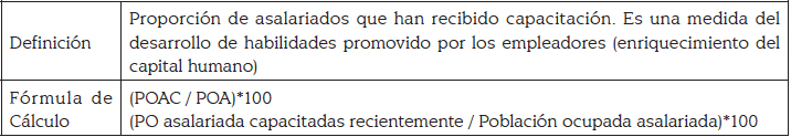 La idea de capacitarse en el trabajo o mientras se desarrolla una actividad laboral se fundamenta en premisas de mayor productividad, en el aumento y la actualización de conocimientos y en la posibilidad de ajustar las habilidades de los trabajadores a la espera de que ello repercuta, tanto en las empresas, como en el trabajador, al provocar más cualificación según el enfoque de la capacitación. Es una medida del desarrollo de habilidades, promovida por los empleadores, que pretende el enriquecimiento del capital humano. En tal sentido, tratar de indagar y obtener resultados sobre la capacitación que reciben los asalariados en esta dimensión de ingresos suficientes y productividad tiene su importancia sobre el trabajo decente; sin embargo, al capturar la información sobre capacitación desde la GEIH solo se puede entrever si los asalariados han recibido algún tipo de capacitación, pero se desconocen el contenido, la duración y la calidad de la misma.