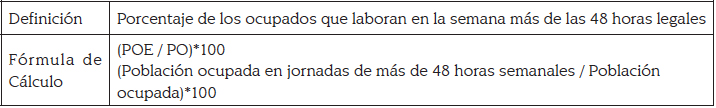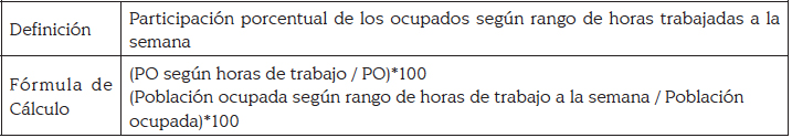 Este indicador muestra la participación porcentual de los ocupados según el rango de horas trabajadas a la semana; en otras palabras, es el indicador anterior pero con una desagregación por rangos de horas inferiores a 48 que es el límite en Colombia. Los resultados dejan ver que cerca de un 70 % de los ocupados trabajan hasta 48 horas, de los cuales un 21,5 % trabaja menos de 40 horas, 10 % trabaja entre 40 y 47 horas, mientras que 37 % trabaja 48 horas, es decir, están en el umbral. De acuerdo con Pineda (2013) este indicador proporciona información indirecta sobre el tiempo que los trabajadores pueden dedicar a actividades diferentes del trabajo, como descanso, vida familiar, trabajo doméstico, etc.