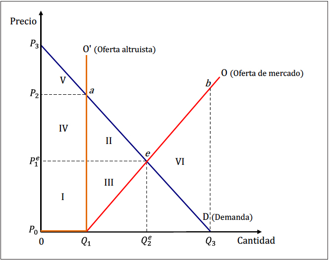 A partir de un análisis simplificado del bienestar se concluye que el sistema actual, de oferta restringida mediante la ley, resulta ineficiente. El análisis parte de considerar que la sociedad se compone de compradores y vendedores, y trata de demostrar que el mercado libre maximiza la suma de los excedentes de los consumidores (receptores) y productores (donantes–vendedores)18. Bajo el sistema actual, en el que la oferta está restringida a la donación altruista, los receptores capturan todo el excedente bruto disponible, suma de las áreas I, IV y V, al no tener que pagar por el riñón injertado, lo que significa que donantes altruistas pierden el excedente que obtendrían si cobraran un precio por sus riñones19.