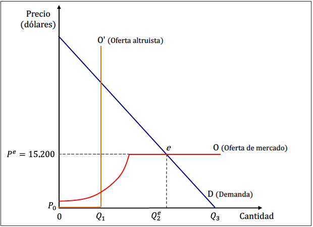 En la gráfica 1 el sistema actual de obtención de órganos está representado por una recta vertical O’ que indica que la cantidad ofrecida cuando el precio es nulo es igual a Q1, que llamamos oferta altruista, y que corresponde al número de órganos disponibles para trasplante bajo el sistema actual de donación15. Dado que la cantidad total que se demanda a un precio nulo es Q3, entonces decimos que se presenta una situación de exceso de demanda equivalente a Q3 – Q1.