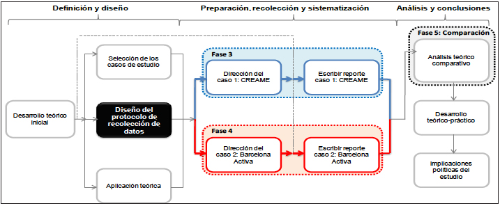 La aplicación de la metodología cualitativa de casos en esta investigación se lleva a cabo bajo el diseño general del estudio de caso múltiple que sugiere Yin (2003), cuya estructura complementaria se sintetiza en el gráfico 1.