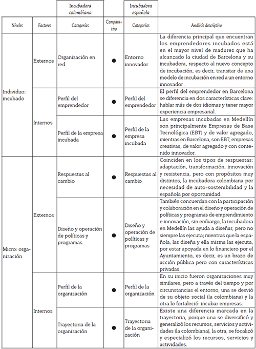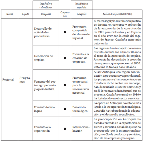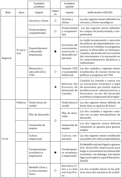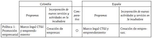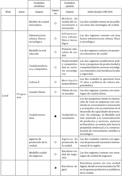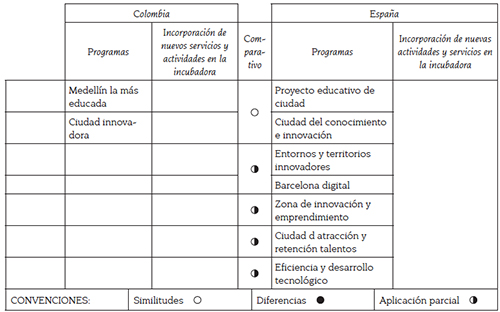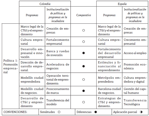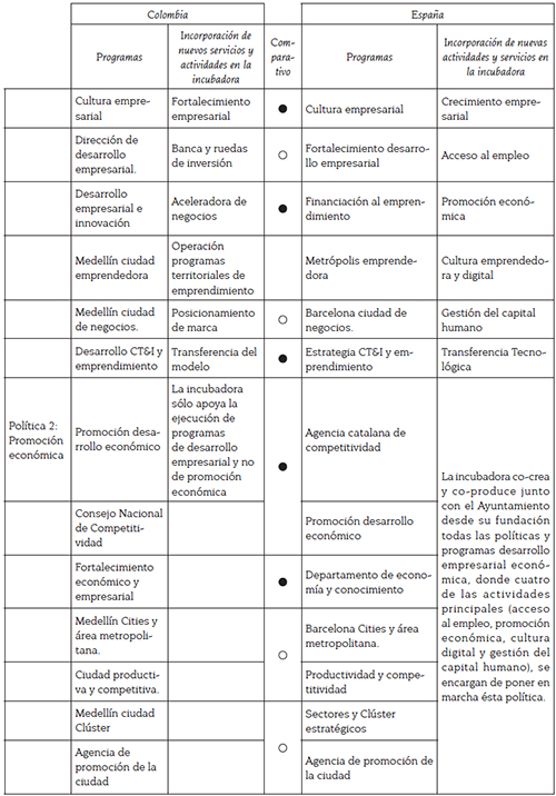 En el análisis del proceso de institucionalización de las políticas y programas de desarrollo empresarial y desarrollo económico de una incubadora respecto de la otra, es necesario retomar de manera selectiva el proceso de incorporación de las políticas y programas en la incubadora colombiana y en la española, con el fin de analizar cuáles han podido institucionalizarse; la siguiente tabla evidencia que las políticas y los programas de desarrollo empresarial, institucionalizados en los dos entornos (Medellín y Barcelona) y en las dos organizaciones, por un lado, son similares en su concepción y ejecución, y por otro, son diferentes en su proceso de desarrollo y maduración, debido a que en Barcelona, además de tener apoyo directo del Ayuntamiento, también se implementa este tipo de acciones en la ciudad desde hace más de diez años.