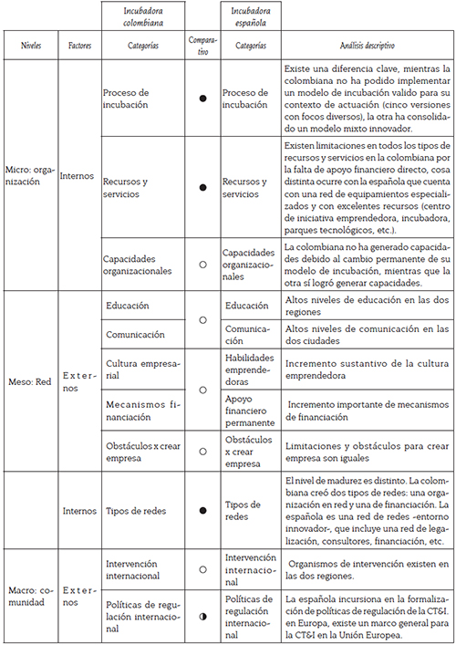La española fue concebida como una incubadora municipal que propiciaba el nacimiento de nuevas empresas, pero su evolución la convirtió en una agencia de desarrollo local exitosa según la OECD (2009), inserta en varios parques tecnológicos que ha promovido. Además, como lo afirma el GEM (2012), los principales aportes han significado el incremento en el número de empresas creadas (624 empresas incubadas en 25 años de operación) y en la tasa de actividad emprendedora (TAE) en los últimos años. Por su parte, la colombiana pasó de ser una incubadora de base tecnológica a convertirse en un centro integral de servicios empresariales que trabaja en red y que ha cambiado cuatro veces su modelo de incubación y lo ha transferido en 15 oportunidades en el país y ocho en el contexto internacional, razón por la cual ha incrementado el relacionamiento, la creación de empresas y el fortalecimiento empresarial en el contexto nacional, a través de su interacción con otros actores del sistema como universidades, cámaras de comercio, centros de investigación, parques tecnológicos, etc.