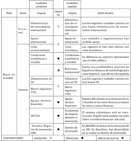 Lo anterior permite identificar la influencia de factores internos y externos, y la existencia, incorporación e institucionalización de políticas públicas y programas de desarrollo empresarial e innovación en cuatro niveles: el individual, que alude al incubado; el organizacional, asociado a la incubadora; el meso, relacionado con la red, y el macro, referido a la comunidad.