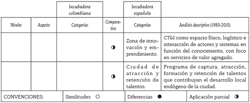 La incubadora colombiana evolucionó en 15 años de vida como Incubadora de Empresas de Base Tecnológica a un Centro Integral de Servicios Empresariales, y en el caso de la española, en 25 años se transformó de una Incubadora de Empresas de Base Tecnológica a una Agencia de Desarrollo Local.