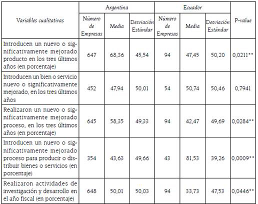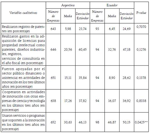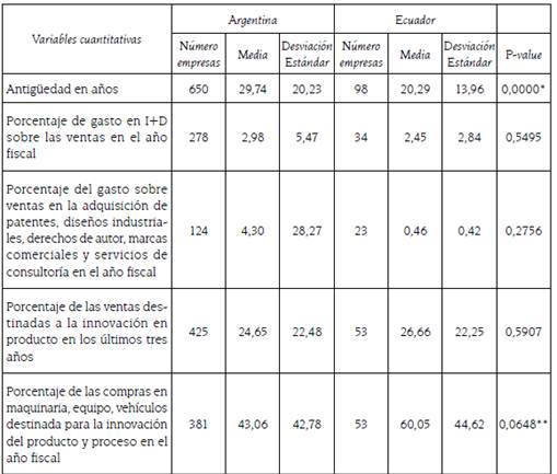 La tabla 3 presenta las características cuantitativas en torno a las actividades de innovación de las empresas argentinas y ecuatorianas que formaron parte del estudio. Es importante señalar que para el análisis estadístico de estas variables se utilizó lo manifestado por Cameron y Triverdi (2009), que exponen que las ponderaciones del muestreo estratificado deben tenerse en cuenta al calcular medias muestrales, a fin de que sean representativas de la población. Los hallazgos permiten establecer las siguientes diferencias con significancia estadística: