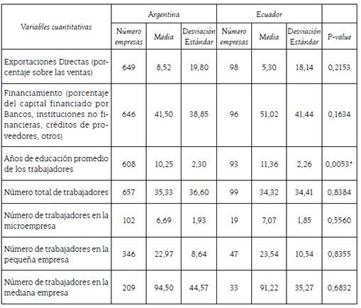 En lo que concierne al número de trabajadores en las micro, pequeñas y media nas empresas, no existe diferencia entre países: los datos del estudio muestran que la media del número de empleados en la microempresa argentina es 7 trabajadores al igual que la microempresa ecuatoriana. La media de trabajadores en la pequeña empresa es de 23 para el caso argentino al igual que para el ecuatoriano, y para la mediana empresa argentina la media de trabajadores es de 95 trabajadores y para la mediana empresa ecuatoriana es de 91 trabajadores. Es importante destacar que ambos países no tienen el mismo número muestral de empresas por aspectos de extensión territorial; sin embargo, la estructura del promedio del número de empleados es similar en ambos.