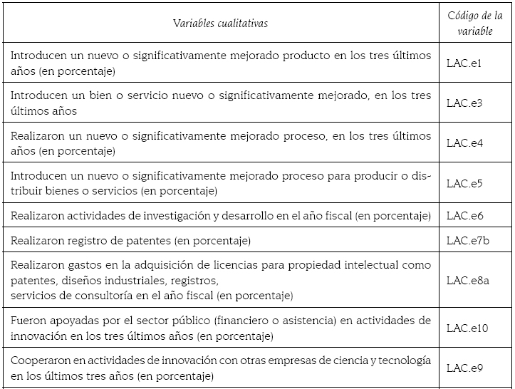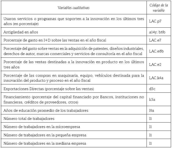 El universo bajo estudio son las micro, pequeñas y medianas empresas manufactu reras de Argentina y Ecuador. La muestra se toma de la base de datos en Enterprise Survey del Banco Mundial de 2010, la cual se encuentra estratificada en tres criterios: ubicación geográfica1, tamaño de la empresa según el número de empleados, y sector de actividad (excluye el sector agropecuario). Para efectos de este trabajo se consi deran como Mipymes solo aquellas empresas que contratan en forma permanente hasta 200 empleados. El estudio se limita al sector manufacturero debido a que la base de datos mencionada incluye preguntas sobre innovación para este sector de actividad. De esta forma, la muestra está compuesta por 99 Mipymes manufactureras pertenecientes al Ecuador y 657 Mipymes manufactureras de Argentina.