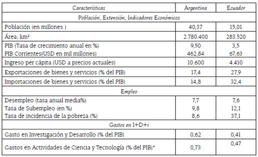 A fin de reflexionar sobre la innovación entre las MIPYMES manufactureras en Argentina y Ecuador, es importante mostrar sus indicadores de contexto que son un componente importante para su comparabilidad. Ambos países están carac terizados por un gran número de micro, pequeñas y medianas empresas, con un alto grado de representatividad en estas economías. Según OCDE/CEPAL (2012), en Argentina las microempresas representan el 81,6 % y las pequeñas y medianas empresas el 18 %. En Ecuador por su lado el 96,8 % son microempresas y el 2,5 % pequeñas y medianas empresas. Una característica importante de las pequeñas y medianas empresas de estos países es la elevada brecha de productividad respecto a las grandes empresas. Una de las principales actividades económicas en los dos países es la manufacturera, por su importancia en la contribución al empleo y por el crecimiento que ha tenido en los últimos años. Con respecto a la contribución al PIB de la industria manufacturera, en Ecuador en el año 2010 representa el 3,4 % del PIB nacional y en Argentina en el mismo año, la industria manufacturera aporta el 6,8 % del PIB nacional. Argentina y Ecuador son países en vía de desarrollo, pero con diferente desarrollo relativo, lo cual justifica hacer comparaciones en el ámbito macroeconómico.