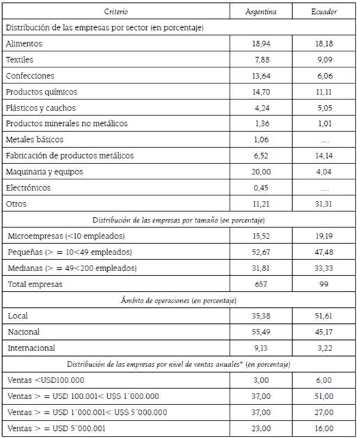 Dentro de las actividades económicas del sector manufacturero, se observa en la tabla 2 que la actividad predominante en Argentina es la fabricación de maquinarias y equipos, seguida de la de alimentos, mientras que en Ecuador es la fabricación de alimentos, seguida de la de productos metálicos. Las Mipymes manufactureras argentinas del estudio muestran como ámbito principal de sus operaciones al mer cado nacional (55,49 %), mientras que las Mipymes manufactureras ecuatorianas de la muestra se diferencian por mayor participación en el ámbito local (51,61 %). En términos porcentuales, el nivel de ventas tiene una estructura de ingresos similar en ambos países en los intervalos de ingresos presentados, con una representación significativa en ambos países en las ventas que se encuentran ente USD 100.000 hasta USD 5.000.000 con una representación de las empresas en este rango del 74 % de empresas para Argentina y el 78 % de empresas para Ecuador. La clasificación de los ingresos se basó en la realizada por Ecuador (Registro OficialTM, 2010).
