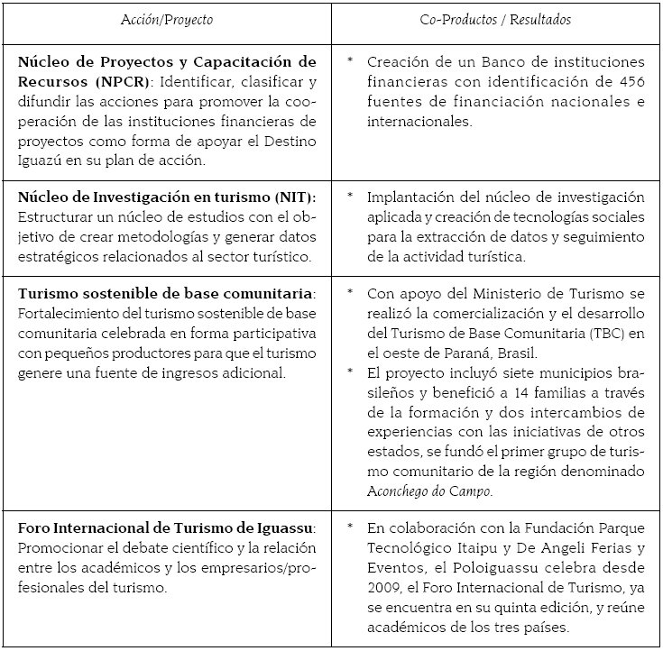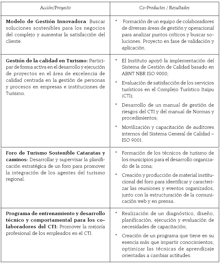 La tabla 1 presenta una síntesis de los actuales proyectos conducidos por el Instituto PoloIguassu en el eje Gestión; ellos representan los resultados del com portamiento coopetitivo de la red, que visualiza el destino como producto integral, al tiempo que desarrolla una gestión colectiva.
