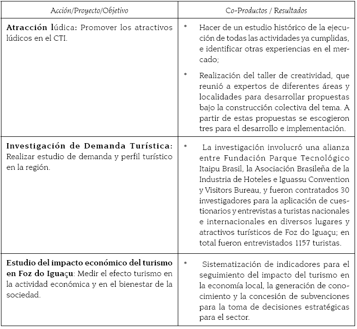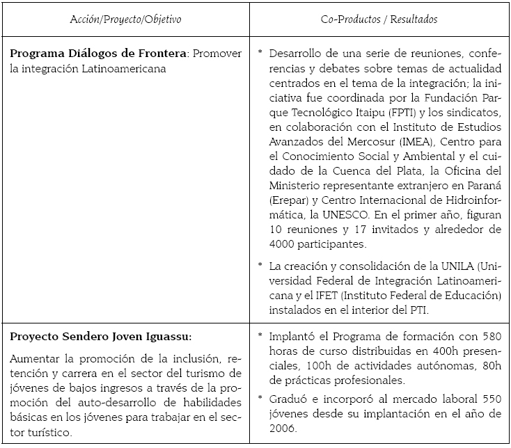 Por Co-producción se entiende el resultado de las estrategias conjuntas, en este caso, los productos generados en conjunto por la red de asociados del PoloIguassu. La co-producción del Instituto fue dividida en tres grandes ejes: