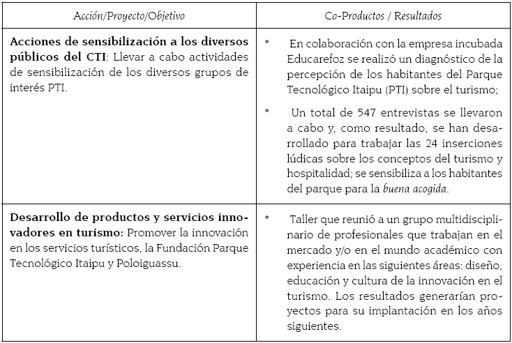Por último, el tercer eje es PoloIguassu educación, en el que destacan cinco proyectos que presentan excelentes resultados, cuyos co-productos son derivados de coopetición y demuestran una madurez de la red hacia el desarrollo sostenible de la actividad turística (tabla 3).
