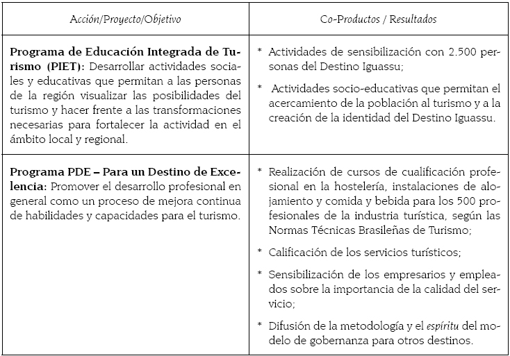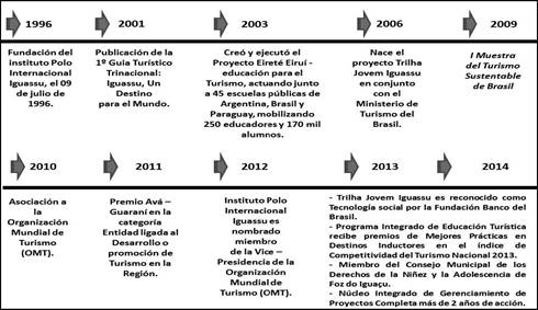 A lo largo de estos 19 años (figura 2) varias acciones se han estructurado en programas continuos del PoloIguassu que han derivado en madurez de la red, fortalecimiento de la gestión, reconocimiento de la comunidad y del sector público dando lugar a la confianza mutua entre los asociados. En el año 2001 comienzan las acciones con visibilidad externa para la población local, gobiernos y empresas. La publicación de una guía turística formalizó, a los ojos del consumidor, el Destino Iguassu, con áreas y atractivos compartidos entre los tres países. A continuación, en 2003 un proyecto de educación para el turismo ejecutado en los tres países tuvo destacada actuación, involucró a más de diecisiete mil alumnos. En 2006 se firma una importante red colaborativa con el Ministerio de Turismo de Brasil para el programa 'Trilha Jovem' (Sendero Joven), que buscó la capacitación e inserción de jóvenes en el mercado laboral del Destino Iguassu. Estas actuaciones fueron reconocidas en la I Muestra de Turismo Sostenible realizada por el Ministerio de Turismo de Brasil (MTur) en 2009. A continuación, en 2010, la trayectoria del Instituto empieza a alcanzar un reconocimiento más amplio que el propio territorio nacional o latinoamericano, pues el Instituto pasa a ser afiliado a la OMT (Organización Mundial del Turismo) y transcurrido poco tiempo es nombrado miembro de la Vice-presidencia de este organismo en 2012. A lo largo del tiempo, ha recibido varios premios, y un buen número de nuevos programas han sido co-creados por los asociados a través de la gestión promovida por el PoloIguassu.