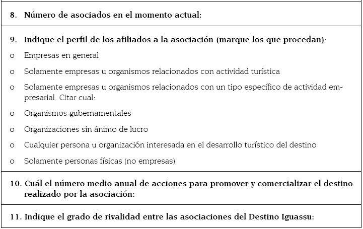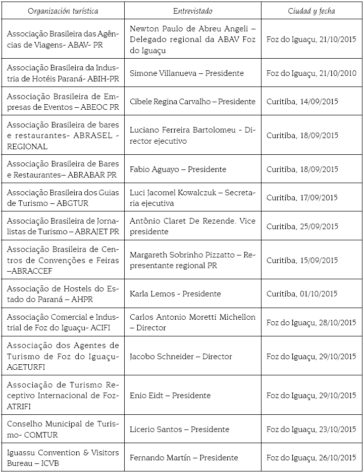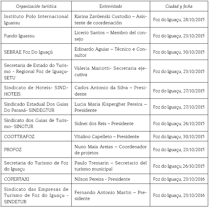 Las entrevistas fueron realizadas con personas clave de las instituciones turísticas asociadas a la red, totalizándose 10 entrevistas en profundidad con duraciones que oscilan entre los 30 minutos y las 2 horas. El contenido de las mismas se centró en obtener información sobre la estructura del destino Iguassu, desafíos y tensiones relacionadas con la competencia y con la cooperación, y las estrategias de desarrollo para el destino integrado (anexo B). A su vez, los archivos y documentos analiza dos fueron los Estatutos de PoloIguassu, los Informes de 'Balance Social' de los últimos 5 años (2010 a 2014), así como comunicados de prensa, folletos y material publicitario generado por la gestión del PoloIguassu. Este análisis verificó la plani ficación de acciones y la efectiva realización de las mismas, así como la generación de co-producción entre los actores de la red. El listado de instituciones turísticas que participaran de este estudio se puede consultar en el anexo A de este artículo.