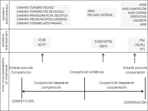 Entre los socios mantenedores predomina la cooperación pura o coopetición basada en la cooperación. Tres de los asociados (Itaipu Binacional, Parque Tecnológico Itaipu e Instituto de Tecnología Aplicada a la Innovación) son instituciones no relacionadas con el turismo de forma directa, sino con la explotación de la energía hidroeléctrica generada por las Cascadas de Iguassu; no obstante, el propio complejo hidroeléctrico y su operación son atractivos turísticos. Así que el interés de estas empresas es mucho más institucional que comercial. No obstante, dos asociados son repre sentantes de grupos de empresas turísticas, además representan al mismo grupo de actividades: los establecimientos de hospedaje, restaurantes, bares y similares (Asociación Brasileña de la Industria de Hoteles y el Sindicato de Hoteles de Foz do Iguaçu). Son instituciones formadas por empresas que compiten en directo entre sí, así que la relación es de coopetición basada en la cooperación, con el objetivo de generar mejoras en el flujo turístico, en las infraestructuras y en el atractivo del destino en general. O sea, a pesar de representar a competidores directos, entre las dos instituciones no hay competencia directa, pero sí colaboración, entonces cooperan para crear estrategias colectivas de generación de valor que beneficiarán a sus asociados.