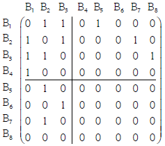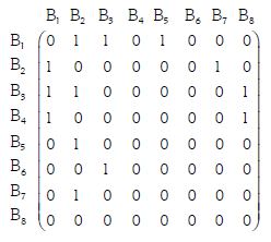 Antes de iniciar el análisis se ilustra con un ejemplo adaptado de Craig y von Peter (2014) el método utilizado para seleccionar el núcleo óptimo. Considere un sistema hipotético formado por ocho bancos: Bi , con i=1,2,...,8. En [9] se tiene la matriz de exposición (volumen) asociada al sistema, una matriz cuadrada de dimensión 8x8, donde se colocan los mismos bancos en las filas y en las columnas, para evaluar sus relaciones: