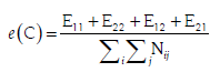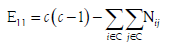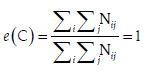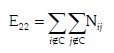 [7]Donde E es la matriz de errores de dimensión 2x2; E11 (ecuación [4]) son los errores en CC o vínculos faltantes; E22 (ecuación [7]) son los errores en PP o vínculos que no deberían existir; E12 (ecuación [5]) errores en CP o inconsistencias en la condición de ser fila regular y E21 (ecuación [6]) son los errores en PC o en la condición de ser columna regular.
