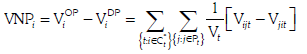 [14]Donde, VNPi es el volumen (relativo) neto de recursos prestados por el banco i a la periferia durante los meses que estuvo en el núcleo.