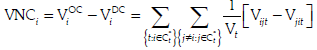 De igual manera en la expresión [15], VNCi es el volumen (relativo) neto de recursos prestados por el banco i a los otros bancos del núcleo durante los meses que estuvo en el núcleo: