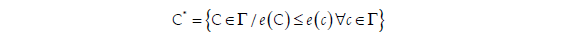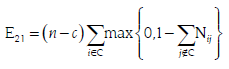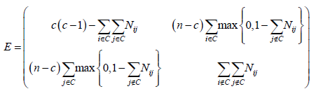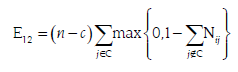 La medida de distancia utilizada es un error total (ecuación [3]) que agrega el número de inconsistencias entre N y M7. Consideremos n bancos, una partición arbitraria de c. bancos en el núcleo y n-c en la periferia. Denotemos el conjunto ordenado de bancos en el núcleo por C = {1,2,3,...c} con la correspondiente per mutación de N. La ecuación [2] contiene los errores en cada bloque: