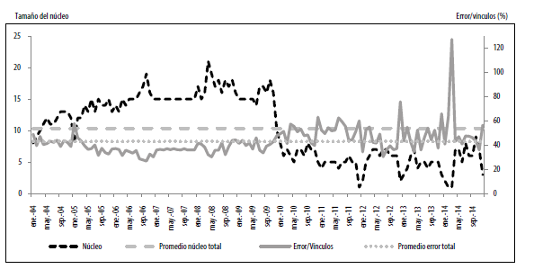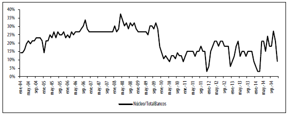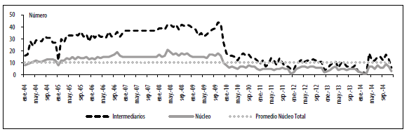 En el gráfico 6 encontramos el comportamiento del tamaño del núcleo y los intermediarios en el tiempo. En todo el período, el promedio de miembros en el núcleo fue 10 bancos. Los resultados aquí encontrados también confirman que el núcleo es, en efecto, un refinamiento de los intermediarios, quienes en promedio están representados por 31 bancos (el núcleo representa 48 % de los intermediarios para la casi totalidad de los períodos). Sin embargo, es claro que a partir de octubre de 2009, hay un cambio sustancial en el número de bancos que conforman el núcleo. Entre enero de 2004 y octubre de 2009, el promedio de bancos en el núcleo fue de 15. Entre enero de 2011 y diciembre de 2014, el promedio fue de 5 bancos.