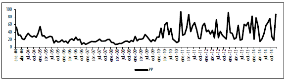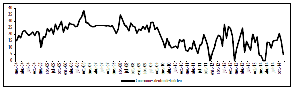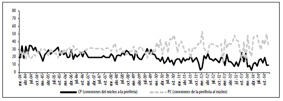 En promedio, entre enero 2004 y diciembre 2014, el 19,8 % de los vínculos de toda la red corresponde a la matriz CP, mientras que 31,07 % corresponde a la matriz PC. Es decir, los vínculos de la matriz PC son superiores a los de la matriz CP, lo que nos indica que los vínculos entre el núcleo y la periferia se establecieron en mayor proporción para prestar recursos al núcleo. Esta diferencia entre las dos proporciones se hace más marcada entre enero de 2011 y diciembre de 2014, es decir, luego de las fusiones e intervenciones bancarias (ver gráfico 11).