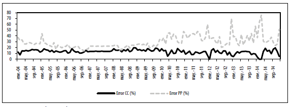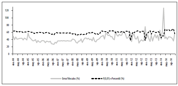 Entre 2004 y 2014, el promedio de los errores fue 43 %10. Sin embargo, luego de las fusiones e intervenciones bancarias el error promedio incrementó. Esto ocurrió pese a que luego de 2010 se redujo el número de bancos, el número de vínculos y la densidad de la red, tal como se mostrará más adelante. A continuación, mostramos otros indicadores para evaluar mejor el ajuste del modelo.