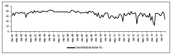 En esta sección se construyen diversos indicadores para medir la conectividad. Algunos de ellos son aplicables a cualquier tipo de red, en tanto que otros están más relacionados con la estructura núcleo-periferia. En total se presentan cinco indicadores para evaluar la conectividad. Todos los indicadores tienden a señalarque a partir del 2009, la conectividad se vio reducida y, por tanto, el riesgo asociado a esta.