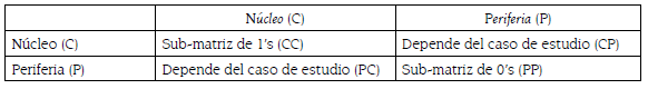 En la formulación matricial de la estructura estilizada, los elementos en los bloques fuera de la diagonal (núcleo-periferia y periferia-núcleo) pueden tomar cualquier valor según el fenómeno estudiado. Borgatti y Everett (1999) se centran en las sub-matrices de 1’s y 0’s ubicadas en la diagonal5.