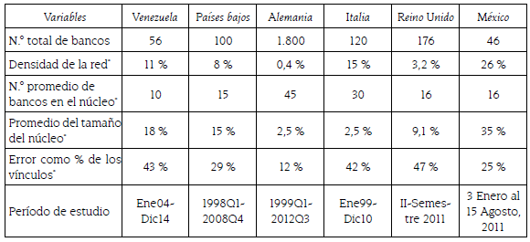En el tabla 2, puede verse que la red venezolana es en promedio más densa que la encontrada en Alemania, Reino Unido y Los Países Bajos, donde los vínculos efectivos son menores a los posibles. Esto puede deberse a los valores mínimos de transacción que fueron usados en los estudios de estos tres países, para describir las conexiones entre bancos. Esto originó que bancos pequeños con vínculos en el mercado quedaran fuera del análisis. Por otro lado, la red venezolana es más dispersa (menos densa) que la de México e Italia debido a que tiene un mayor número de bancos sin conexión.