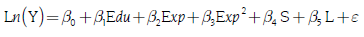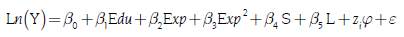 Según Asplund y Pereira (1999) y Psacharopoulos y Patrinos (2004) en esta estimación se plantea como variable dependiente el logaritmo de la remuneración salarial por hora, y como variables independientes características socioeconómicas del trabajador (ecuación 1). En este sentido, el modelo se interpreta como semilogarítmico estimado por medio de mínimos cuadrados ordinarios (MCO); como insumo se utilizan datos transversales de las encuestas de empleo.