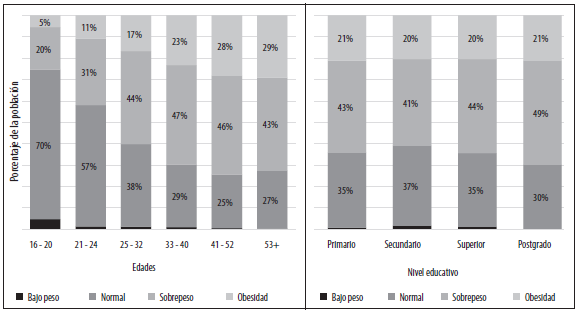 Dentro de los ocupados ecuatorianos se observa la prevalencia de la obesidad según el aumento de la edad (gráfico 1). En las edades de 16 a 20 años, las per sonas obesas por IMC alcanzaron el 5 %, mientras que en los mayores de 53 % el porcentaje alcanza el 29 %. Por nivel educativo, la distribución de los grupos por IMC se mantiene.
