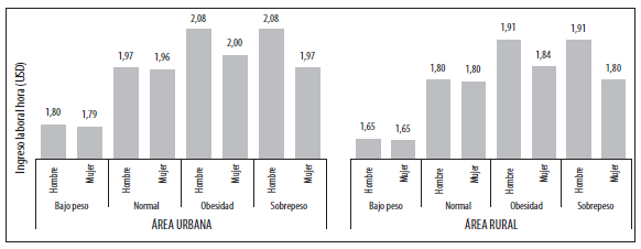 Por su parte, los trabajadores urbanos (73 %) tienen salarios significativamente más altos frente a los rurales (USD 2,01 vs USD 1,44) junto con medidas de peso y talla más elevadas. En términos de etnias (indígenas, afrodescendientes, montubios), estas ocupan porcentajes de alrededor el 16 % de la población y presentan menores salarios. Es interesante resaltar los menores niveles en términos de peso y talla que presenta la población indígena ecuatoriana. Finalmente, la mayor parte de la población ocupada (80 %) tiene un nivel de educación inferior a Secundaria, a la vez que se observa que a mayor capital humano (grados de escolaridad) aumenta el salario.